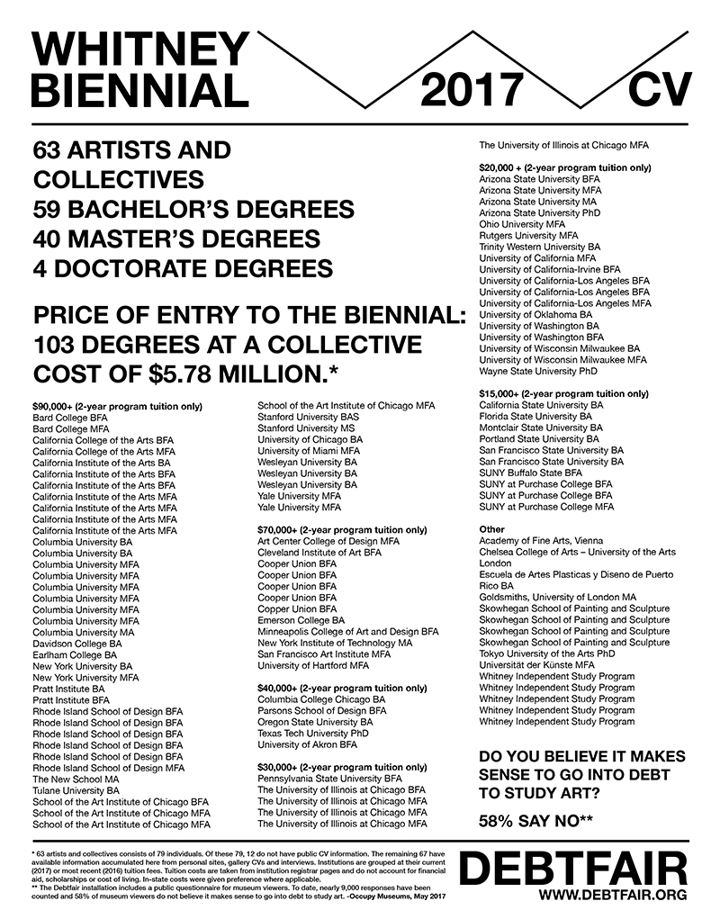 The invitation to produce an iteration of Debtfair for the 2017 Whitney Biennial provided us with a tremendous opportunity to fully realize the project’s core vision: to expose the debt and extraction codified within the walls of a luxury art institution. Here, BlackRock, Inc., the world’s largest asset management corporation with $5.1 trillion in assets under management (larger than the US economy), acts as a lens for understanding the relationship between artists, their debt, and international banking and investment firms. 500 artists participated; their art and stories are featured online and projected in the Museum.