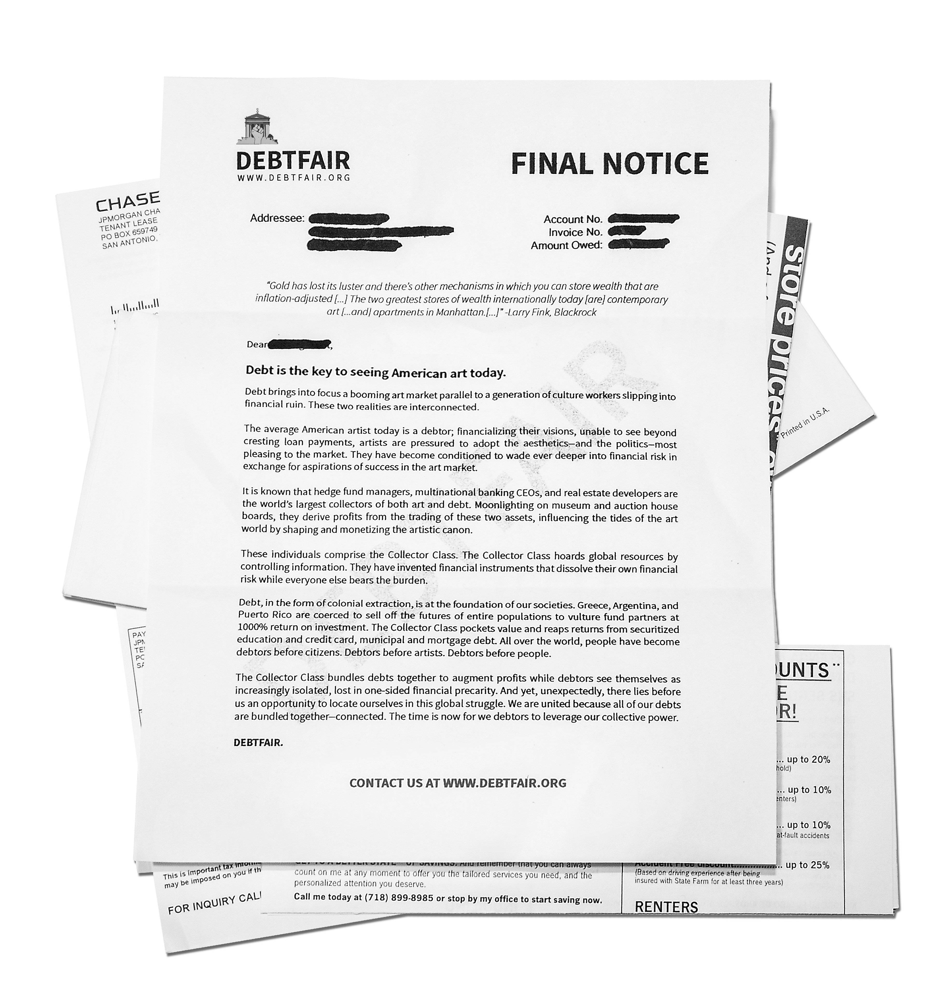 An exhibition-intervention by Occupy Museums that exposes the relationship between global economic inequity and artists’ growing debt burdens. The project functions as an exhibition and organizing mechanism that intervenes within “fine arts” institutions via physical and digital platforms. Original artwork is accepted through a non-juried open call, which includes an online questionnaire to delve into the relationship between the artists’ creative aspirations and their economic realities.