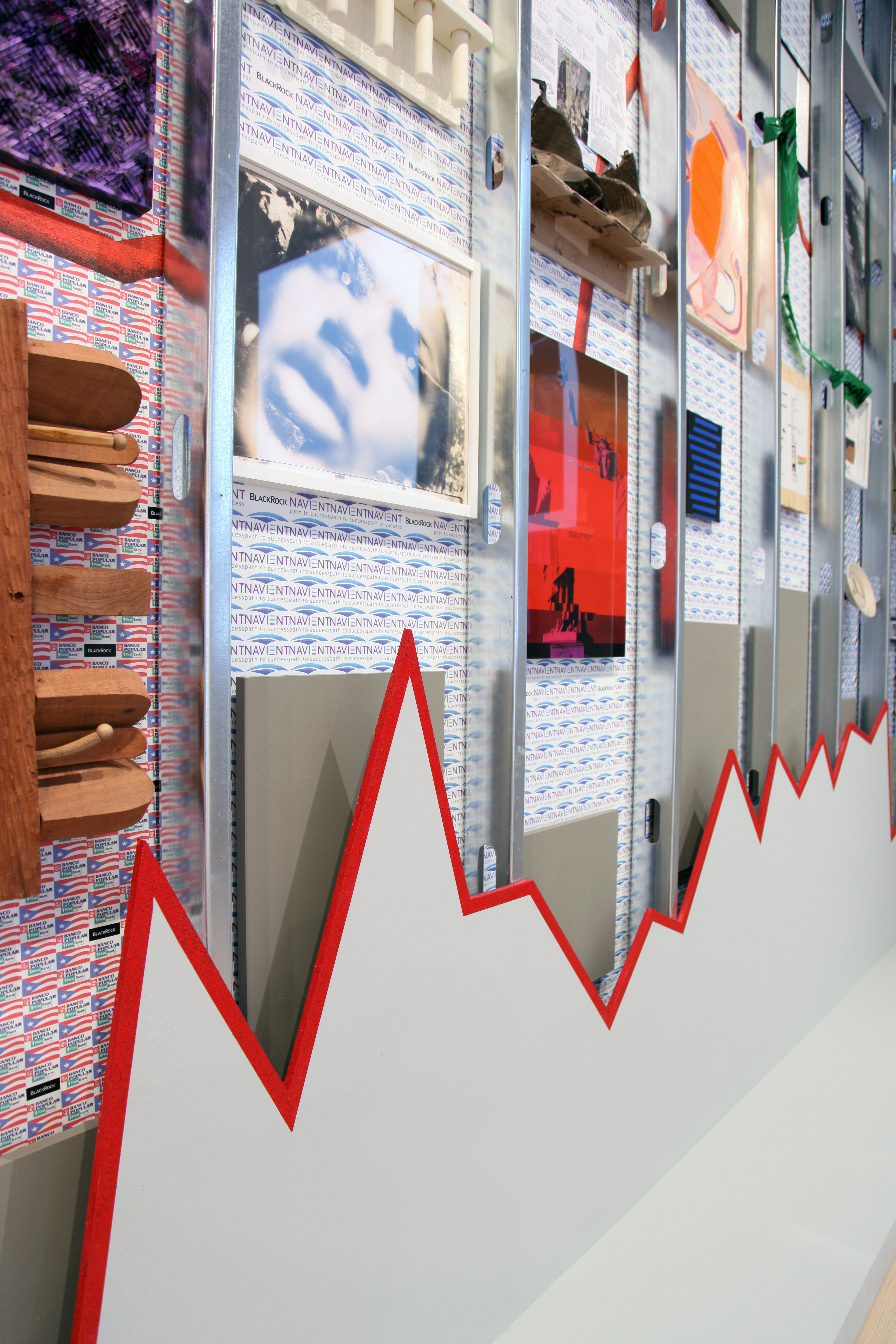 The art of 30 artists is embedded in a gash in the wall formed by two graphs showing art market profits and BlackRock assets over time and organized into three “bundles”: Puerto Rico (artists with debt to Banco Popular and other Puerto Rican institutions affected by the debt crisis), Navient (student loan debt); and JP Morgan Chase (credit card debt and mortgages). BlackRock is a majority owner of these companies and profits from the inability of artists to pay back their debts.