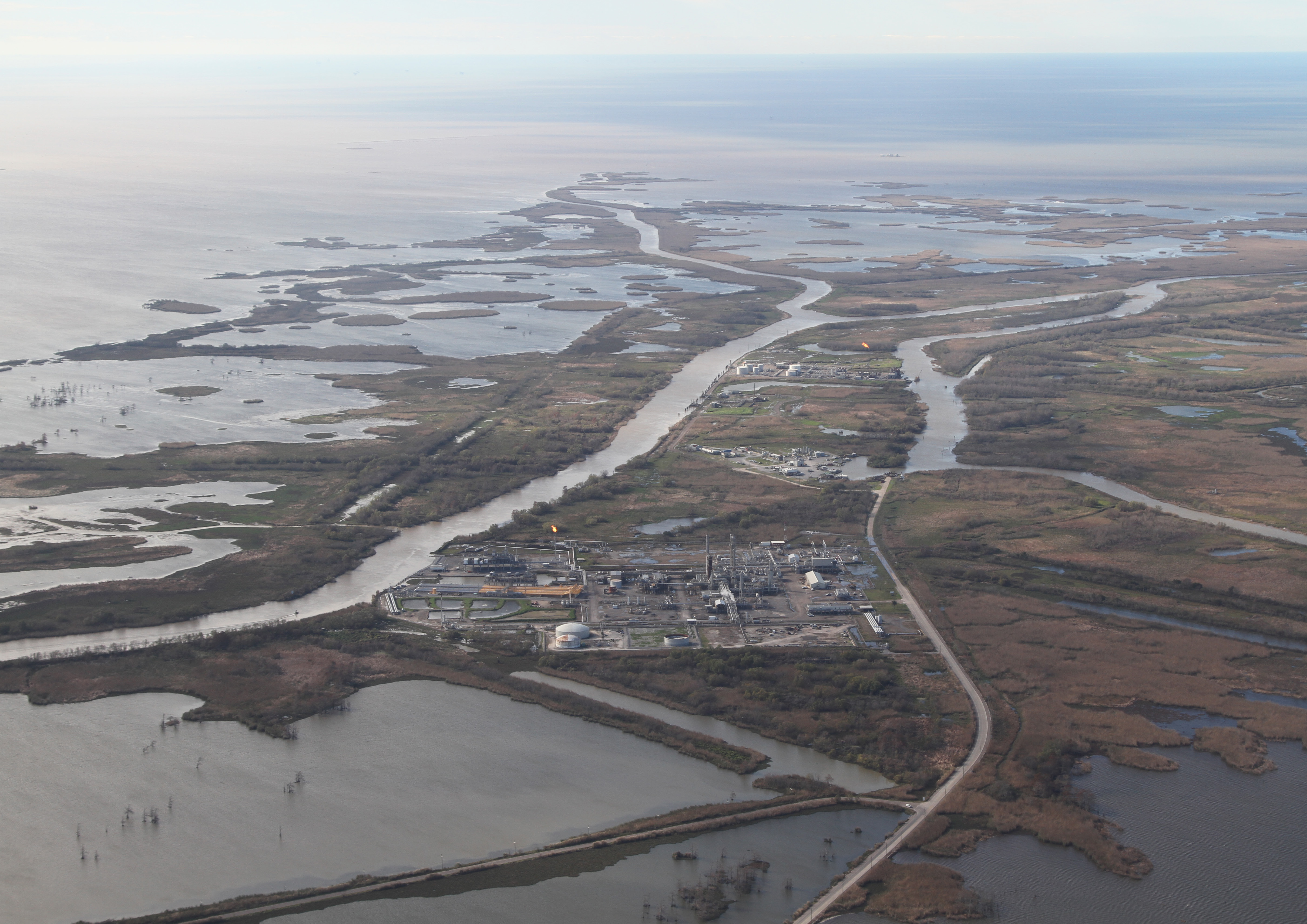 Since the discovery of oil in the 1930s, fossil fuel corporations have dredged 10,000 miles of canals in order to drill and access over 75,000 wells, which connect to Cancer Alley’s refineries and petrochemical plants via 50,000 miles of pipeline. The canals usher salt water from the Gulf into freshwater wetlands, killing the vegetation that holds sediment together as land.